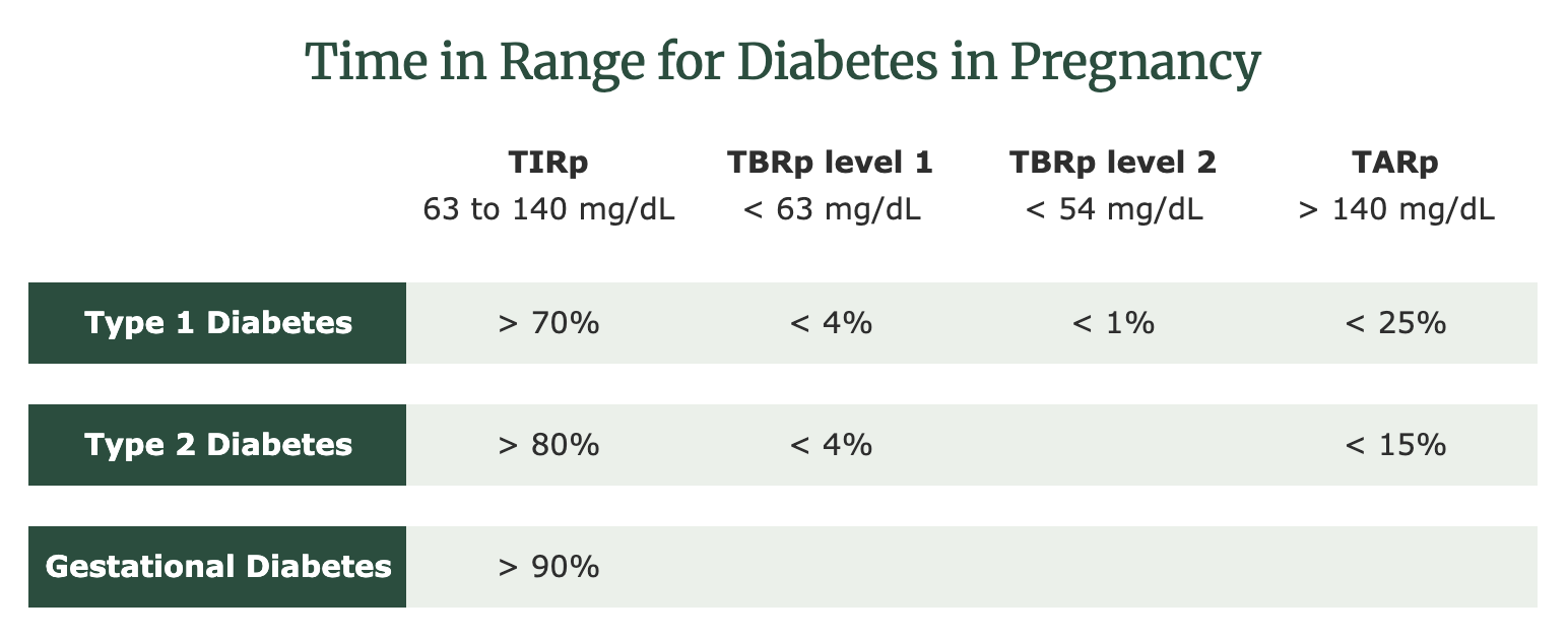 When it comes to sensor data, one major indicator of diabetes management is TIR. TIR is the amount of time, measured in percentage, in which a person is within glucose target range. According to the ADA, the current recommendations for TIR during pregnancy (TIRp) in type 1 diabetes (T1DM) are as follows: